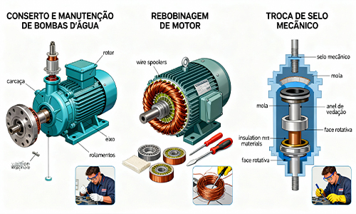 Rebubinagem, troca de selo mecânica, usinagem de eixo e peças em geral.